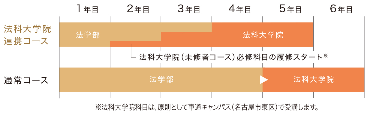 法学部に設置されている法科大学院連携コースでは、現在、司法試験早期合格をめざし、複数の学生が、法学部に所属しながら愛知大学法科大学院の授業も並行して受講しています。このコースに所属すると、学部2年次から法科大学院未修者コースの必修科目を段階的に学び、学部を3年で卒業したのち、愛知大学法科大学院既修者コースに進学することが可能です(進学にあたっては、筆記試験が免除されます)。法科大学院のチューター制度を利用したり、大学院内の専用スペースで自習できたりするなど、各自のペースで着実に勉強を進められる環境も整っています。
