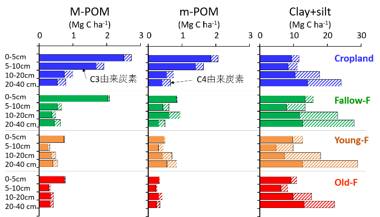 図2:休閑年数が異なる圃場に蓄積した土壌炭素の由来を画分毎、層位毎に評価した図。