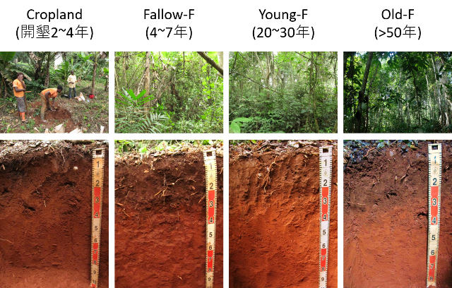 図1:カメルーン東部の熱帯林における焼畑‐休閑サイクルの景観と土壌断面の写真。