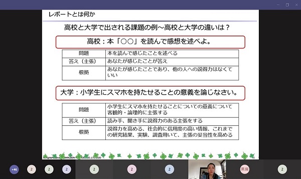 高校と大学で出される課題の違いについての説明から、レポートは何かを知り、実際のワークを通して理解を深める講座です。
