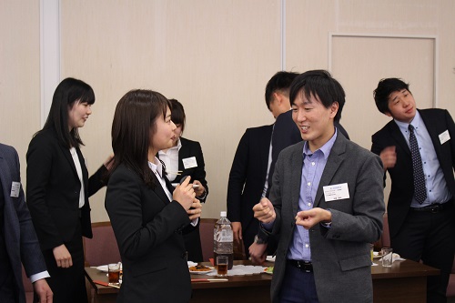 総会の後には、懇談会が行われ、低年次学生はアドバイザーから早速情報収集を行い、アドバイザー同士は情報共有をする姿が見られました。