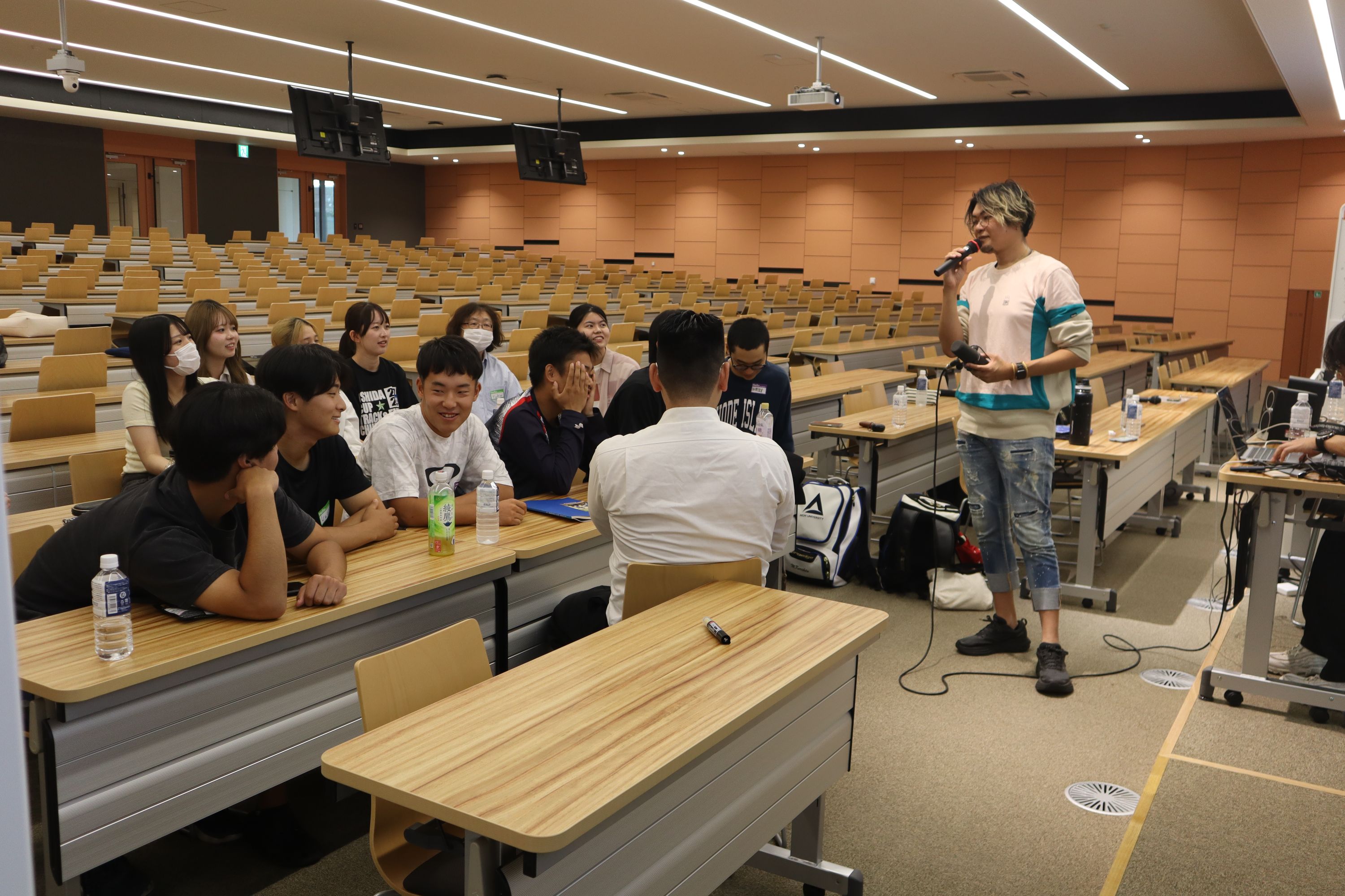 井手次郎氏(アニメ「ONE PIECE」の主題歌、ファンタCMソング、世界柔道公式ソングなどを制作)、前迫潤哉氏(Snow Man「EVOLUTION」、NiziU「JOYFUL」、欅坂46「ガラスを割れ!」等数多くの有名アーティストの作詞・作曲を手掛ける)等音楽業界で活躍されている専門家に作詞・作曲等を担当していただくことになり、その第1弾として、10月2日(木)名古屋キャンパスで、10月9日(木)豊橋キャンパスで、学生が参加した歌詞制作ワークショップを開催しました。学生たちの夢や入学の理由、愛知大学への想いを語り合い、それがプロの手により即興で素晴らしい歌詞楽曲に形を変えていきました。ワークショップの最後には、前迫氏の迫力ある歌声に学生たちのバックコーラスも調和し、教室中に素晴らしい音色と学生たちの笑顔が響き渡りました(知のフィルハーモニーを具現化)。