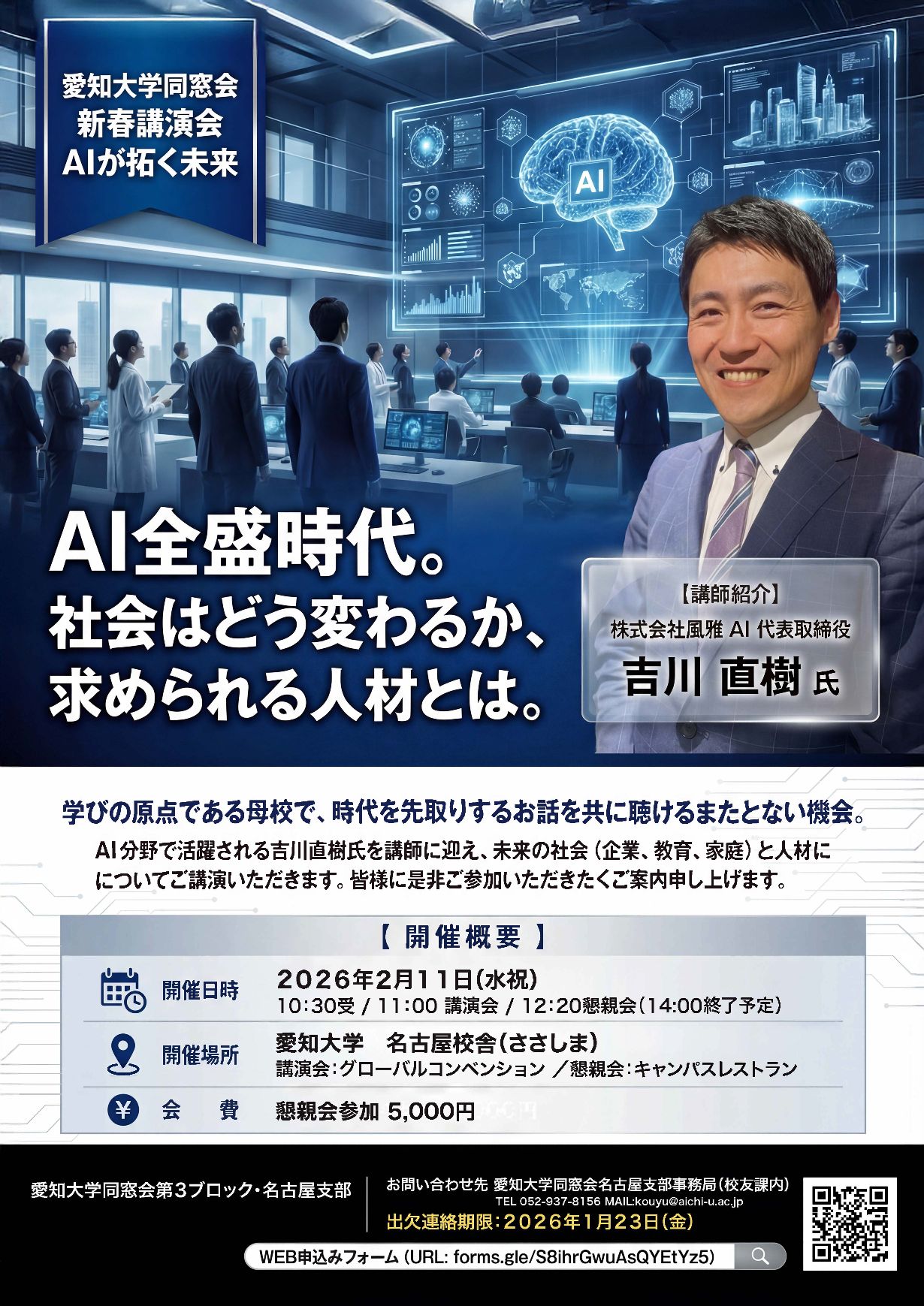 さて、下記のとおり、「愛知大学同窓会第3ブロック・名古屋支部新春講演会・懇親会」を開催いたします。