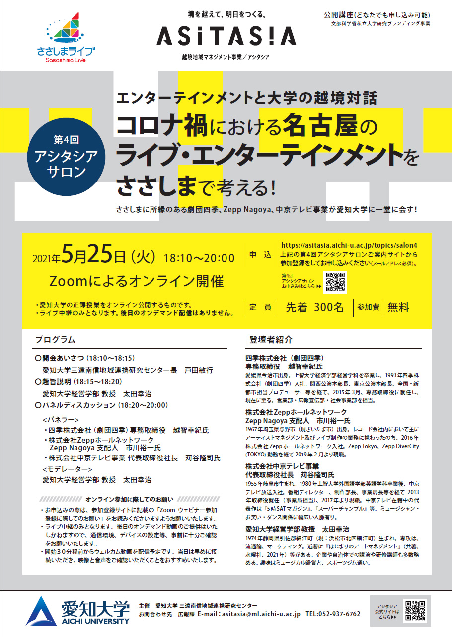 第4回アシタシアサロン「ーエンターテインメントと大学の越境対話ーコロナ禍における名古屋のライブ・エンターテインメントをささしまで考える!」を開催します