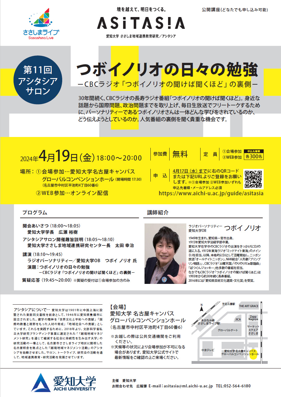 第11回アシタシアサロン「つボイノリオの日々の勉強-CBCラジオ『つボイノリオの聞けば聞くほど』の裏側-」を開催します
