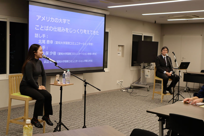 話し手として国際コミュニケーション学部 北尾泰幸教授、聞き手として国際コミュニケーション学部4年 古久保汐佳さんが登壇、「アメリカの大学でことばの仕組みをじっくり考えてきた」と題し、軽快なスタジオトークが展開され、本学関係者(学生、教職員、卒業生)、一般の方など約50名が参加しました。
