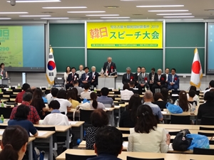 これは韓国籍、日本籍の学生がそれぞれ相手国側の言語でスピーチを行い、双方の立場でより深く互いを理解し交流を深めることを目的に、毎年本学を会場に行っているものです。