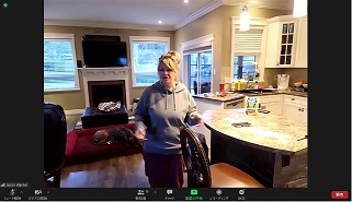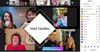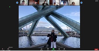 このプログラムは、カナダバンクーバーと日本との時差を考慮し、日本では朝9時から、バンクーバーでは夕方の4時からの開始とし、1日3時間弱、5日間、現地の人たちとの「交流」を中心に実施しました。ホストファミリーとの交流では、バンクーバーにいるホストファミリーが実際に家の様子を撮影しながら案内し、カナダと日本の生活や家庭の違いなどを話していました。カナダ人大学生との交流では、小グループに分かれて、各々の大学生活やバイト、趣味、また日本でのおすすめの訪問場所や、カナダで行ってみたいところなどを話したり、ジェスチャーゲームをしたりしました。バンクーバー市内観光では、バンクーバーのことを英語で説明を受けたあと、現地大学生に実際にバンクーバー市内から街の様子を伝えてもらいました。