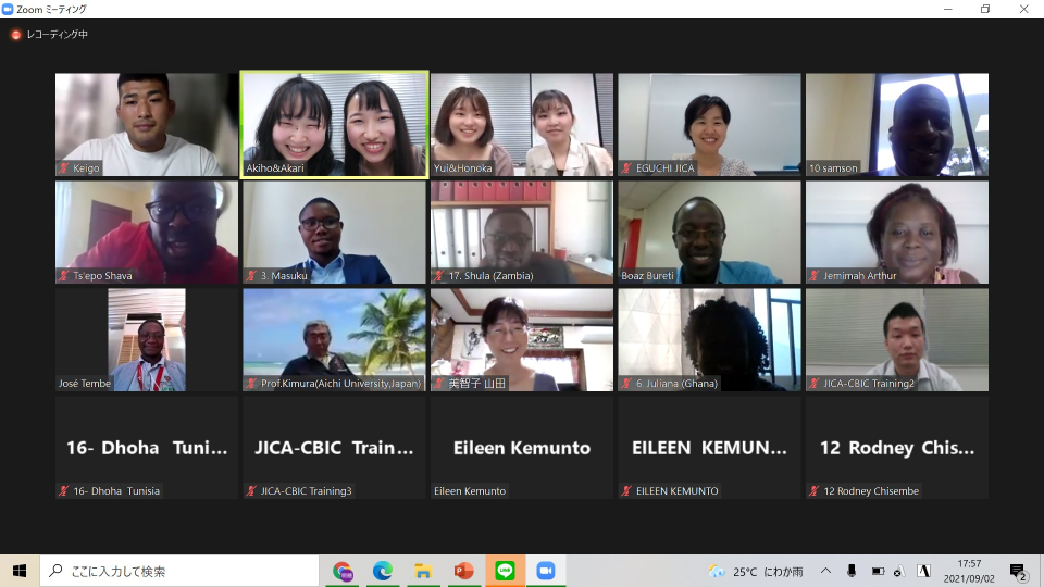 研修員のかたは、ちょうど JICA中部のオンライン研修中で、終了後にガーナやケニア等、計 16カ国から19 名が参加されました。