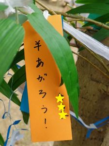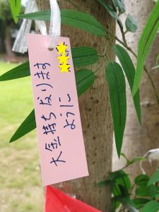 留学に行く」といった願い事を短冊にかいて笹に飾り付け、写真をとった