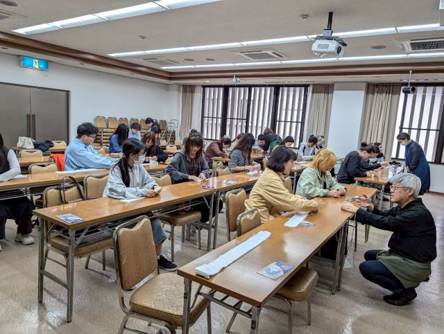 有松絞りについてレクチャーを受けながら実際に絞り染めを体験しました。