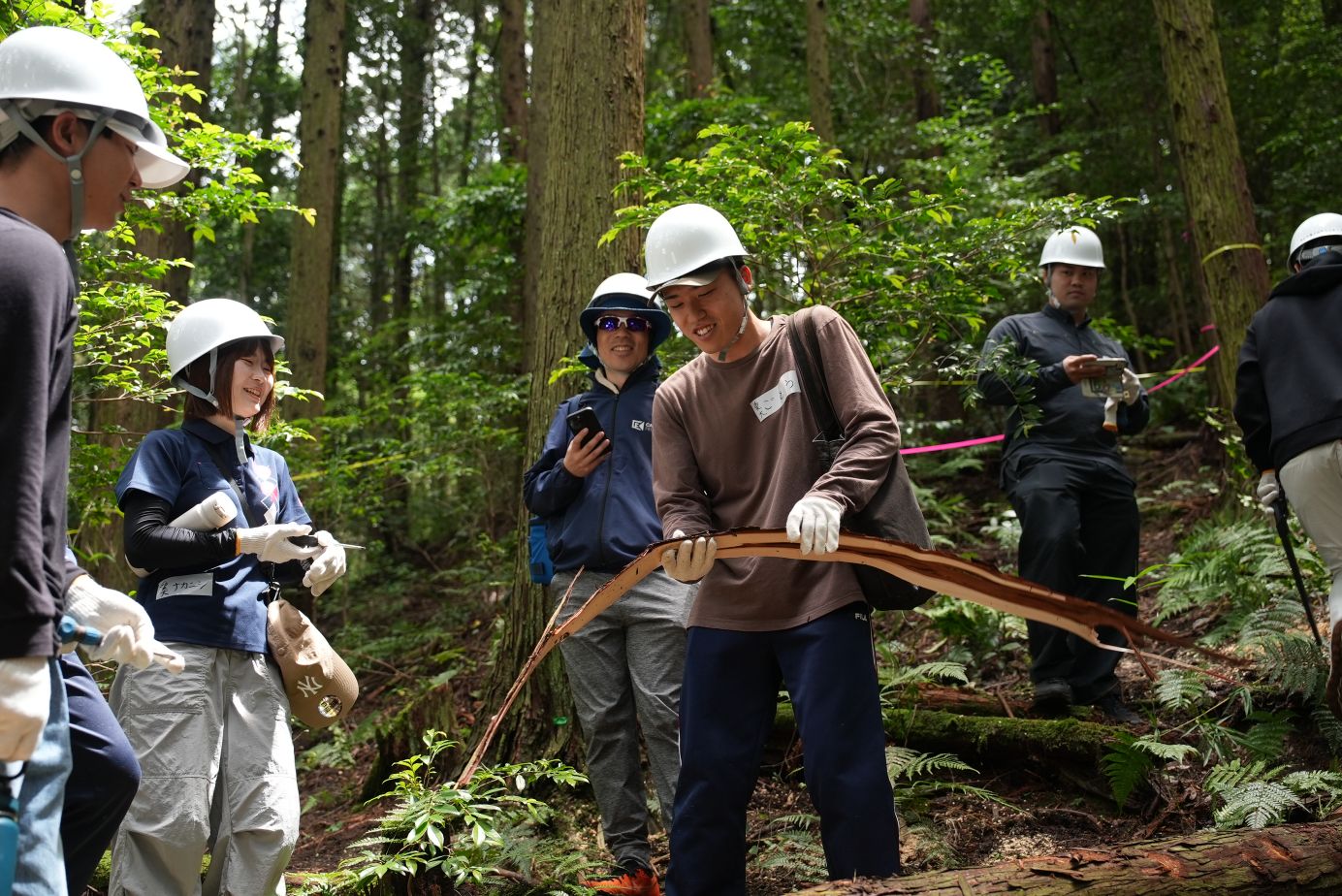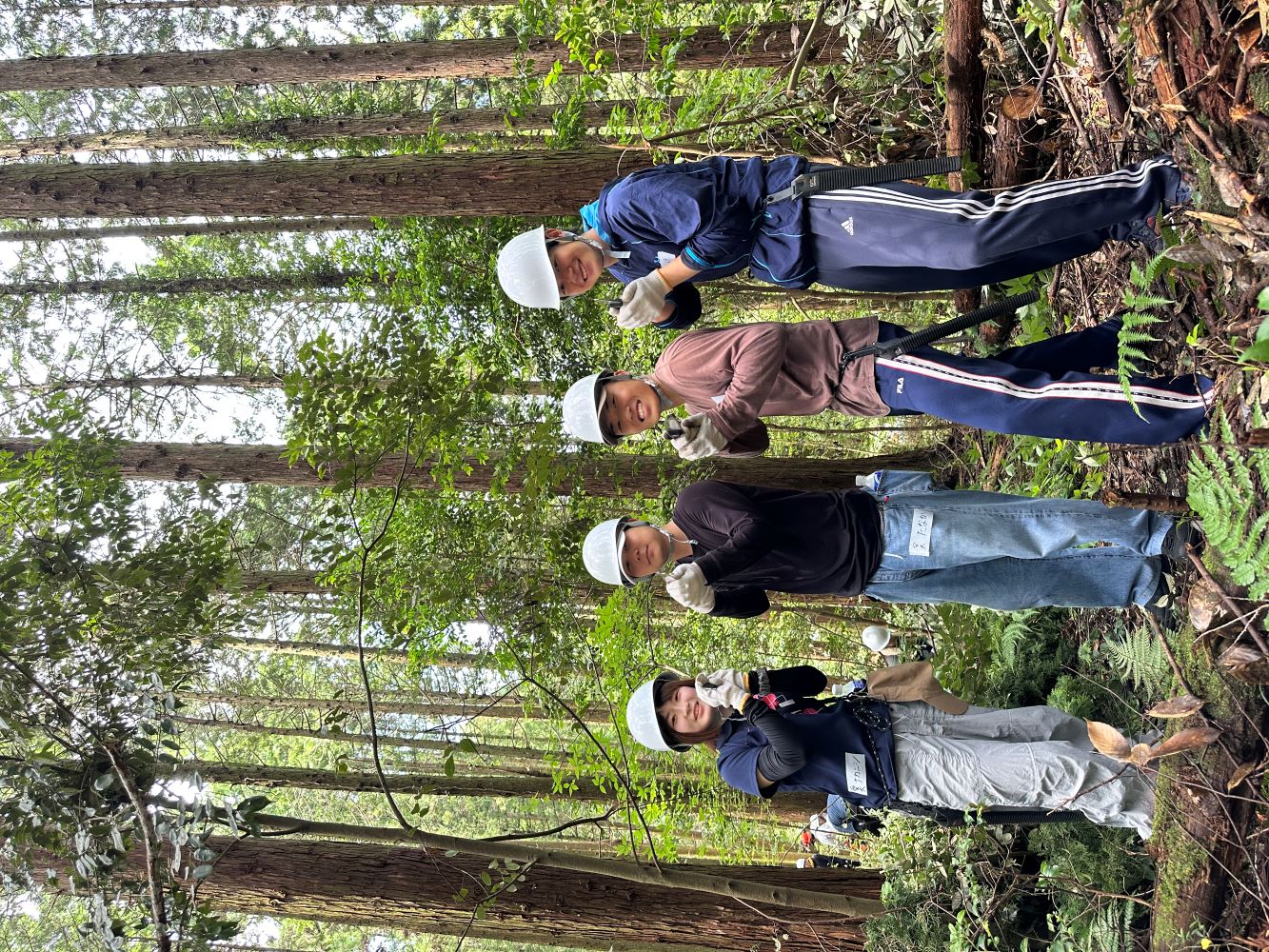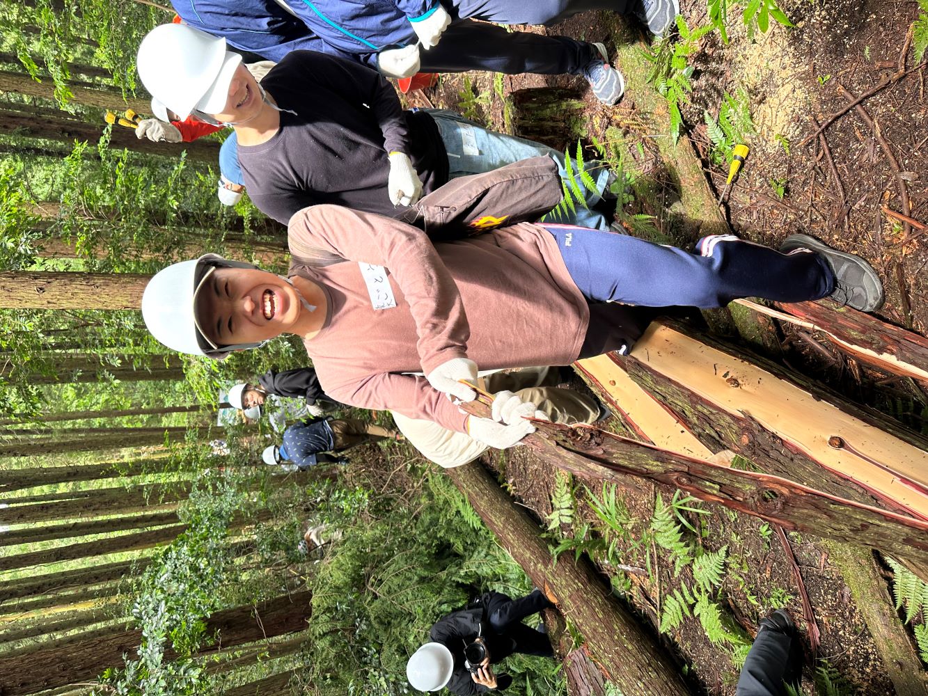 5名前後でチームに分かれ、午前中に木の皮をむく作業や、木の成長を遮らない為に、光を取り入れる目的で伐採し、伐採を行うために「除伐」と「間伐」を行い、午後から、丸太で階段をつくる作業となりました。