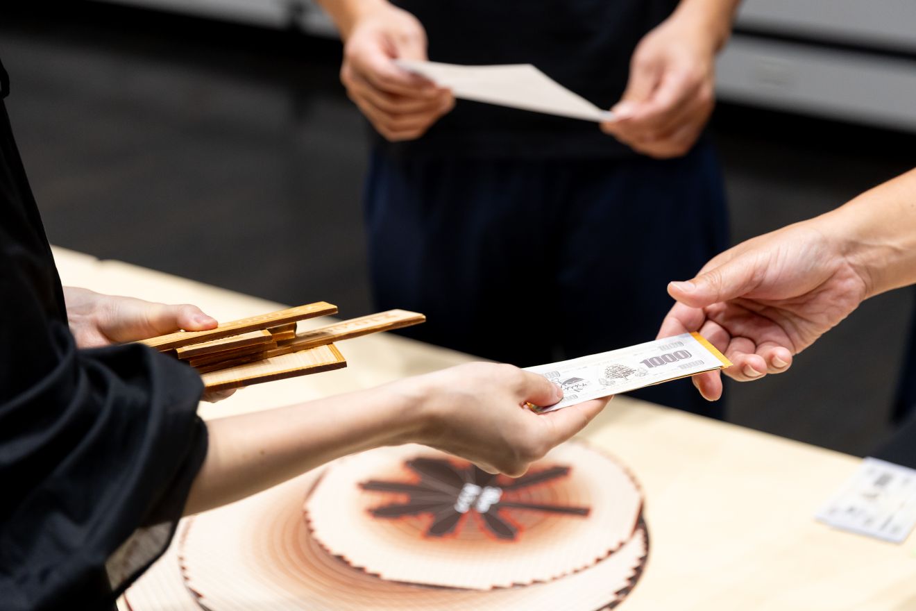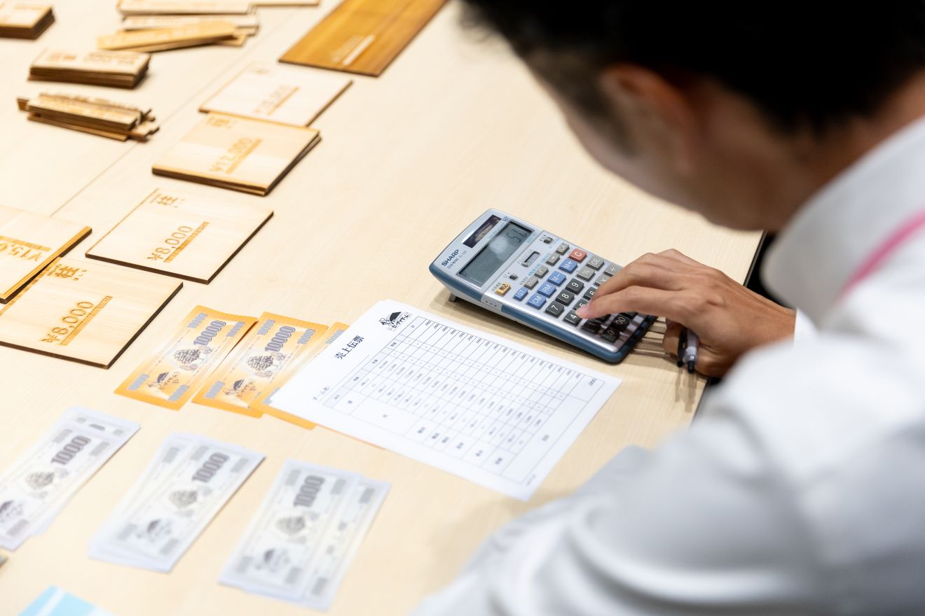 ゲームの中では自分たちが製材会社の経営者になりきって、木材の仕入れ(競り)から加工、販売までを体験しました。そして、利益が出るようにチームで競い合いました。