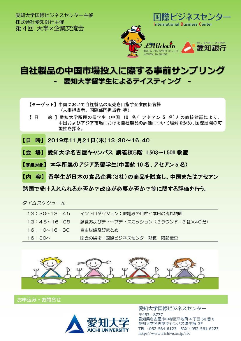 【内容】留学生が日本の食品企業(3社:確定済)の商品を試食し、中国またはアセアン諸国で受け入れられるか否か?改良が必要か否か?等に関する評価を行います。