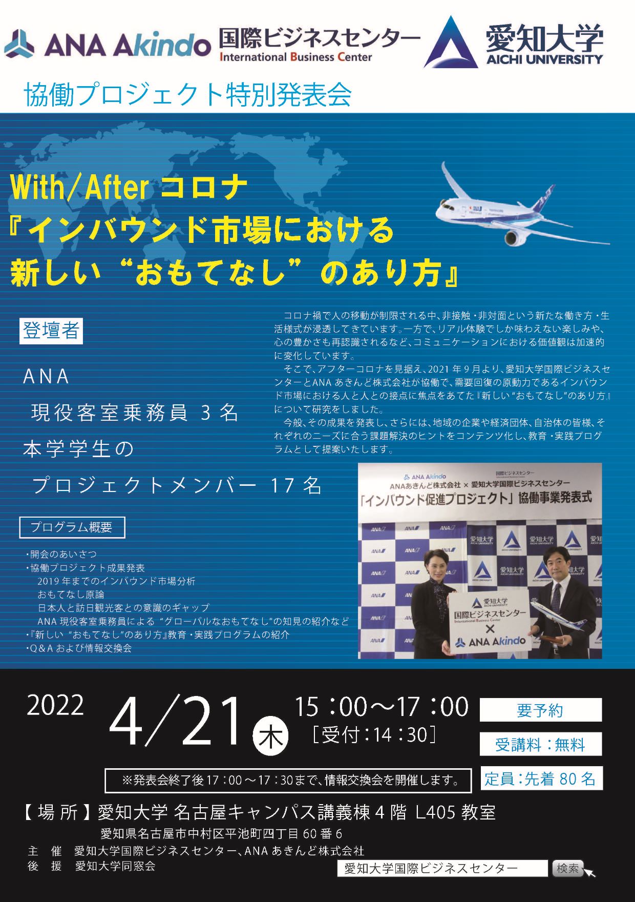 当センターでは、2021年9月にANAあきんど株式会社と協働し、「With/Afterコロナを見据えたインバウンド促進プロジェクト」を立ち上げました。このプロジェクトは、ANA現役客室乗務員と本学学生が観光関連企業などへの“新たなおもてなし”の提案をする特別発表会となります。