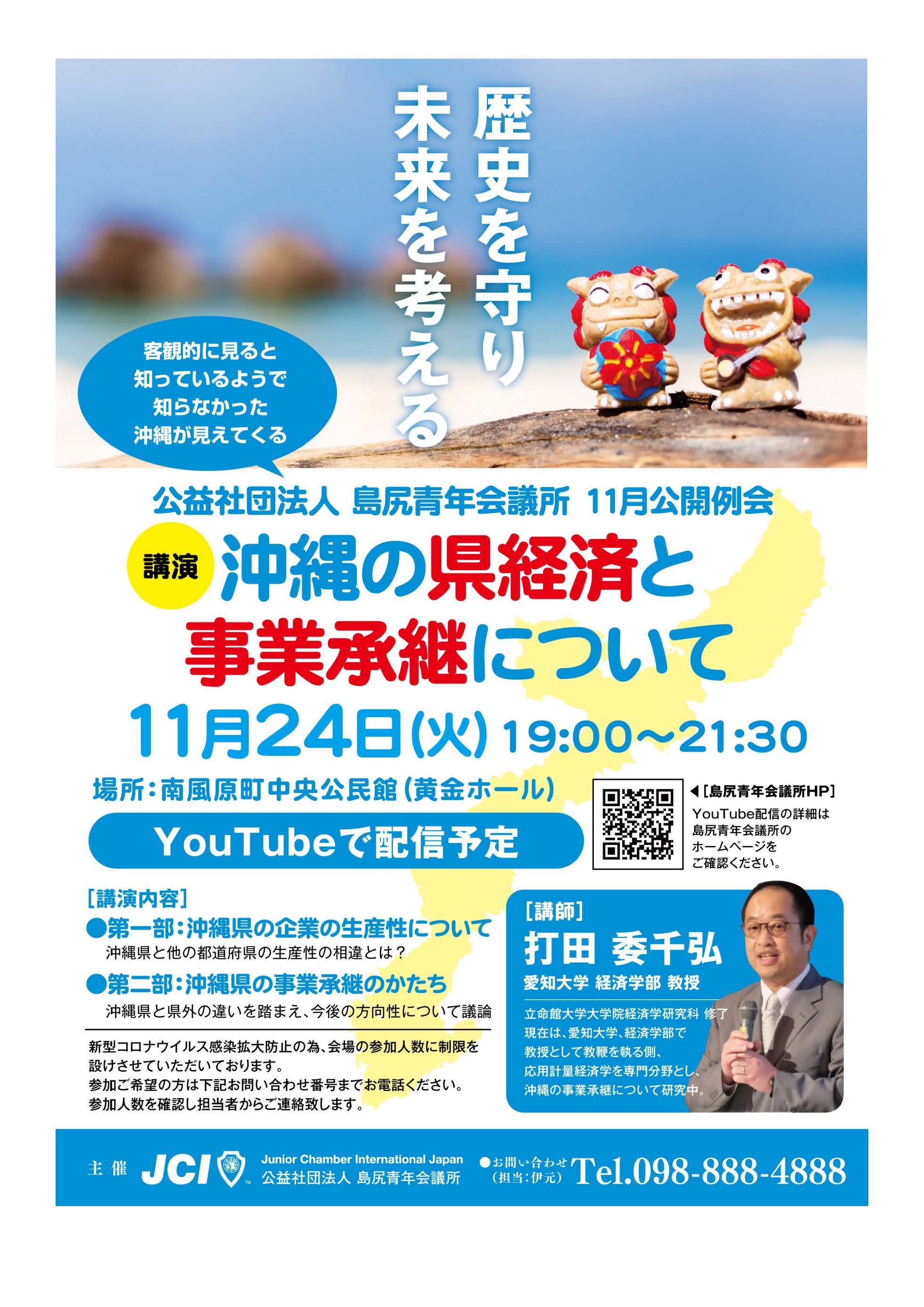 11月24日(火)、公益社団法人島尻青年会議所(事務局:沖縄県島尻郡南風原町)11月公開例会にて、経済学部打田委千弘教授が「沖縄の県経済と事業承継について」と題し講演を行いました。
