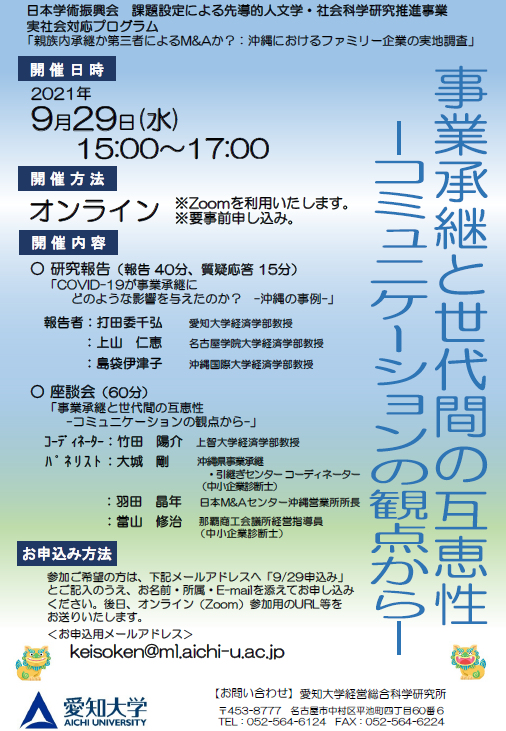 日本学術振興会における〈課題設定による先導的人文学・社会科学研究推進事業(実社会対応プログラム)〉として、経済学部・打田委千弘教授(研究代表者)が実施してきた研究課題『親族内承継か第三者によるM&Aか?:沖縄におけるファミリー企業の実地調査』の研究成果報告会です。(本事業期間:2018年10月〜2021年9月)