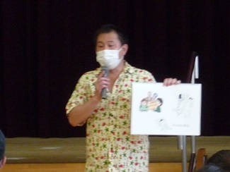 (2)13:20-14:40 松井直之先生の講演「日本国憲法についてのおはなし」。担当:松井直之教授、通訳:吉田滋男さん。松井先生が手作りのスケッチ絵を使いながら説明されました。この場には、日系ブラジル人で弁護士となられた照屋エイジ弁護士(愛知県弁護士会)、ボランティアで参加していただいた愛知大学国際コミュニケーション学部生シェン・ディラーラさん、院生の岡亮輔君を交えて、なごやかな雰囲気で講演が行われました。