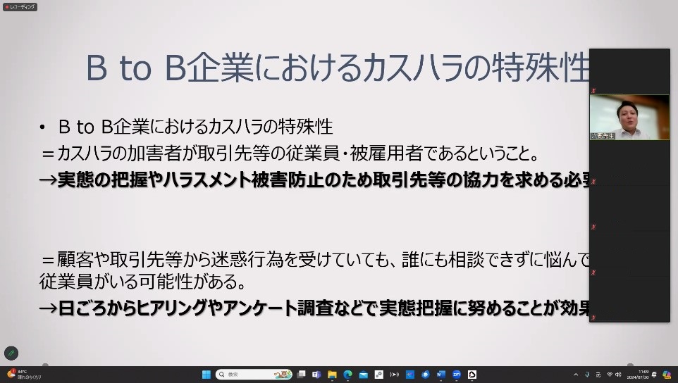 参加者は、岡谷鋼機およびそのグループ会社の従業員約50名で、対面とオンラインのハイブリッド形式で実施された。カスタマーハラスメントに関する最近の裁判例の紹介や従業員が加害者・被害者となる場合の法律関係、事前防止策など一般的な内容と商社のようなB to B企業特有の問題とに分けて講じられた。最後に13分程度質疑応答の時間が設けられ、ほぼ時間いっぱいまで数件の質問があり、この問題に関する関心の高さが窺われた。
