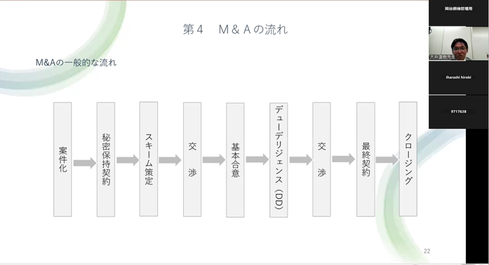 第2回は、M&Aについての導入講義であり、会社を取り巻く関係者の確認、M&Aとは何か、M&Aの手法にはどのようなものがあるか、M&Aの流れなどについて、丁寧に説明された。