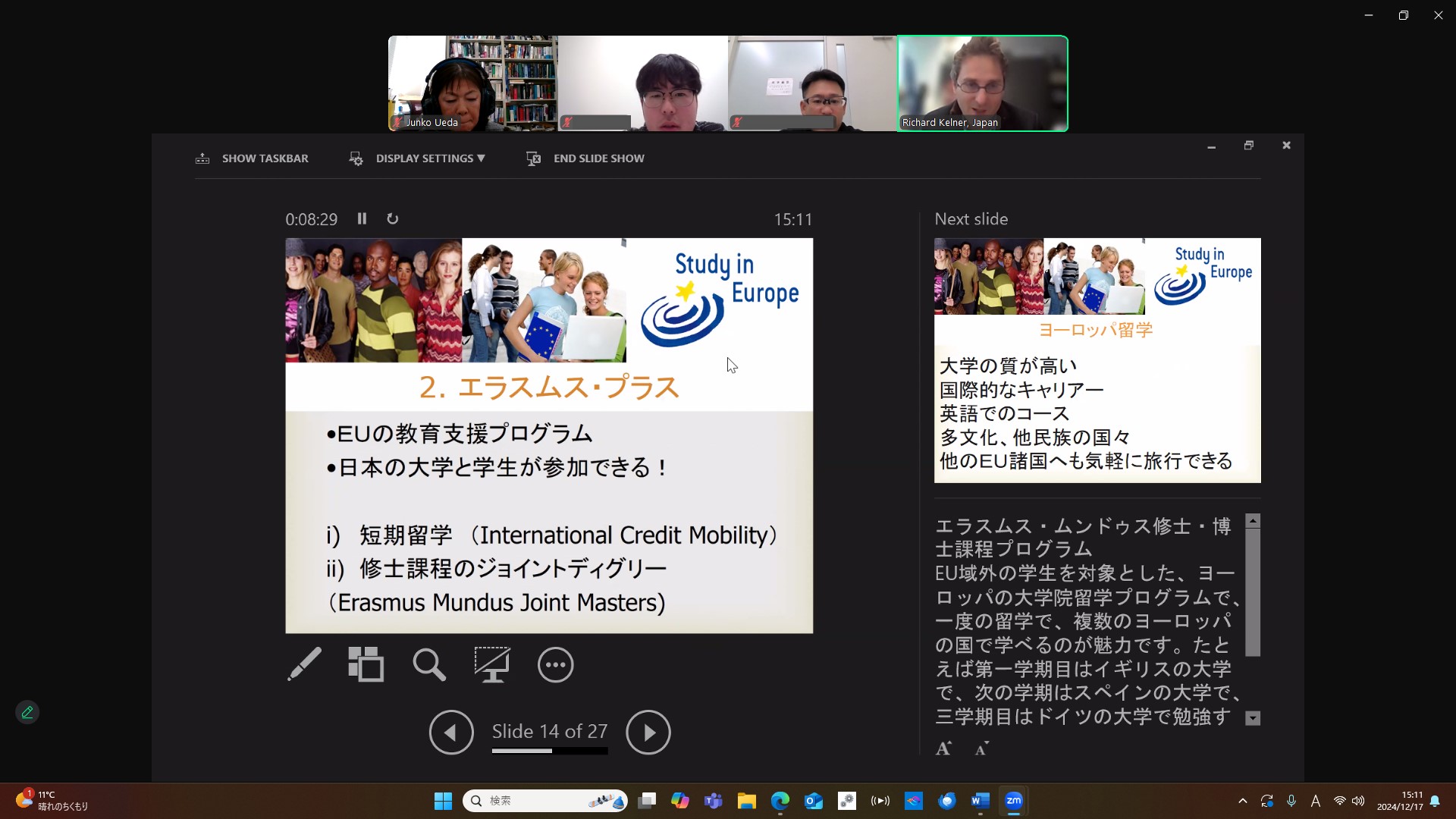 2024年12月17日(火)15時から駐日EU代表部の教育プログラム広報担当オフィサーであるRichard Kelner氏をお招きして、オンラインによるErasmus Mundus(EU域外から欧州の大学へ留学する際の奨学金制度)説明会を開催しました。