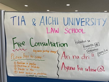 地域居住外国人への法的支援事業の一環として、2025年12月7日(日)13時00分から15時00分の日程で、杉本みさ紀弁護士(本学法務研究科修了、本学非常勤講師)及び通訳者(タガログ語、ビサヤ語の)2名にご協力いただき、公益財団法人豊田市国際交流協会(TIA)様主催「クリスマスイベント(パーティー)」(会場:豊田産業文化センター3階)において法律相談ブースを出展しました。