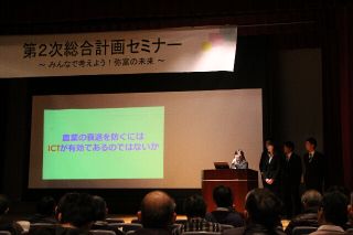 当日は一般市民約280名が来場する中、3つのグループがそれぞれ 「獣害の観点から考える空き家対策」、「金魚産業の法人化について」、 「農業振興におけるICT普及~行政によるICT企業と農家のマッチング~」 というテーマで発表を行い、服部市長、中京大学釜田教授、 名城大学手嶋教授から貴重なコメントを頂戴しました。