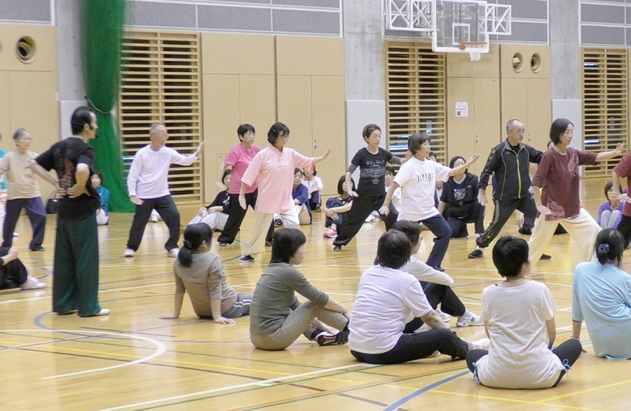厚生棟6階アリーナにて「二十四式太極拳」を受講しているみなさん