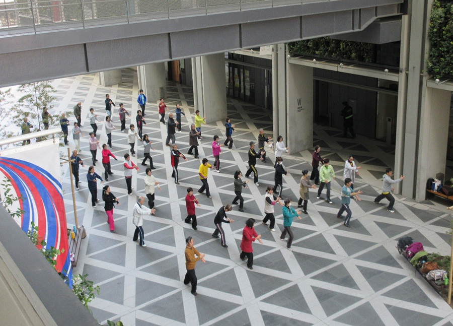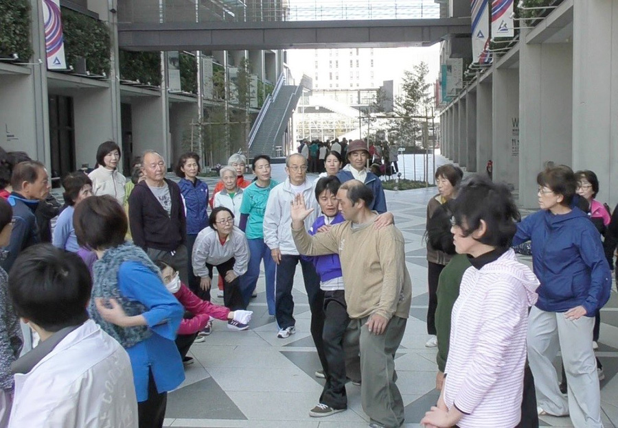 キャンパスモールにて「総合太極拳」を受講しているみなさん