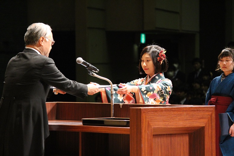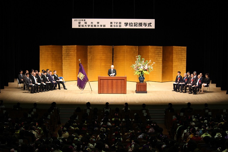 川井伸一学長・理事長は各研究科、各学部の代表学生に学位記を授与するとともに、告辞として「大学で身に着けた能力をベースに仕事等のなかで絶えず学習し能力をさらに伸ばし、生涯学び続けるという自覚をもってほしい。愛知大学で学んだこと、愛知大学の卒業生であることに誇りをもち、新たな人生のステージで活躍されることを切に期待する」と述べました。