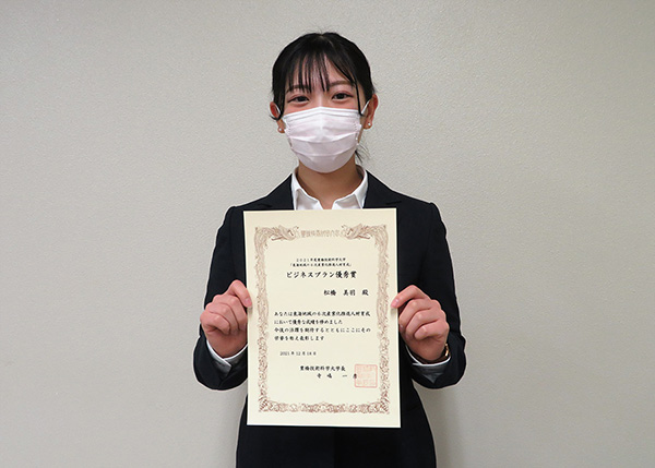 同プログラムへの現役大学生の参加は今回が初であるとともに、プログラムのメインとなるビジネスプラン発表会では松橋美羽さん(地域政策学部3年)が優秀賞(全体2位)を受賞しました。