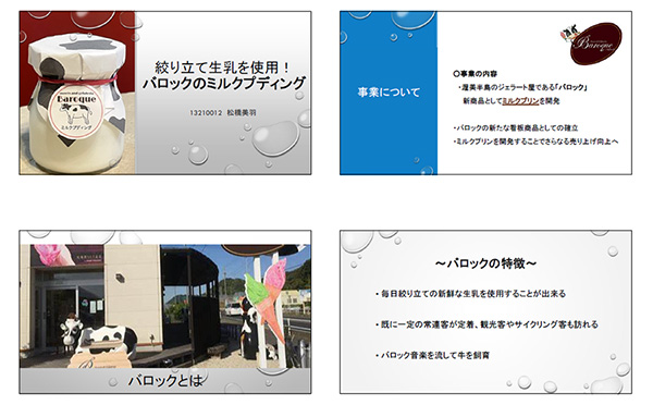 プログラムの最終目標となるビジネスプラン発表会の目的は、ターゲット顧客・市場の設定や原料調達、価格設定、マーケティング戦略など講義で学んだ知識を活かして、実現可能な商品・サービスを形成することでした。全員で何度も検討会を行い、より現実的で収益の得られる事業を考えました。私はゼミで現地実習をさせていただいたことがある愛知県田原市のジェラート屋さん「バロック」を題材にして、新鮮な生乳を使用したミルクプディングの製作・販売を立案し、優秀賞をいただくことができました。