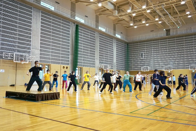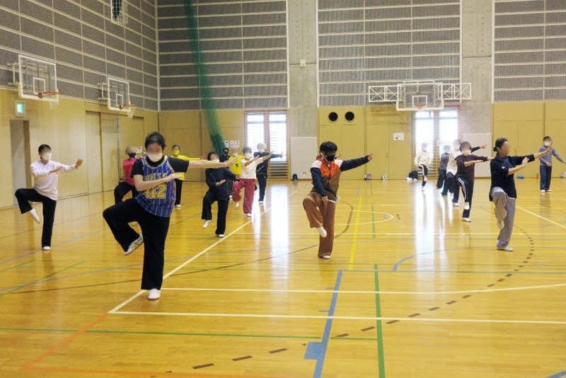 厚生棟6階アリーナにて「二十四式太極拳」を受講しているみなさん