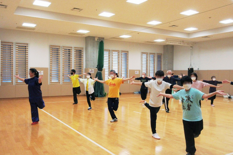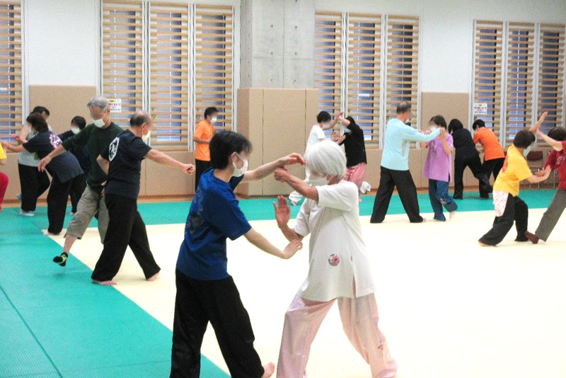 厚生棟6階アリーナにて「総合太極拳」を受講しているみなさん