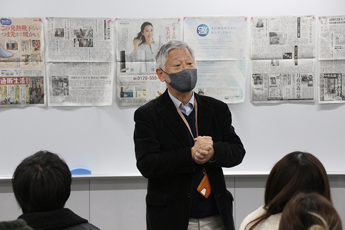 本授業は、一般社団法人中部経済連合会(中経連)の産学共創によるキャリア教育(人材育成)実践策「キャリア教育共創プログラム」の一環として実施され、今回は、朝日新聞名古屋本社統括センターの平子義紀部長を講師に招き行われました。