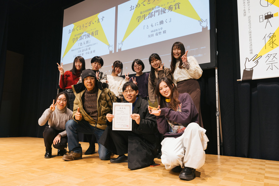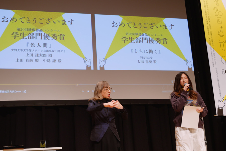本学文学部人文社会学科現代文化コースメディア芸術専攻上田謙太郎ゼミで制作した映画『色人間』が第20回さがの映像祭で「学生部門優秀賞」を受賞しました。監督を担当した学生(文学部三年生)が代表して、賞状を受け取り、スピーチをしました。