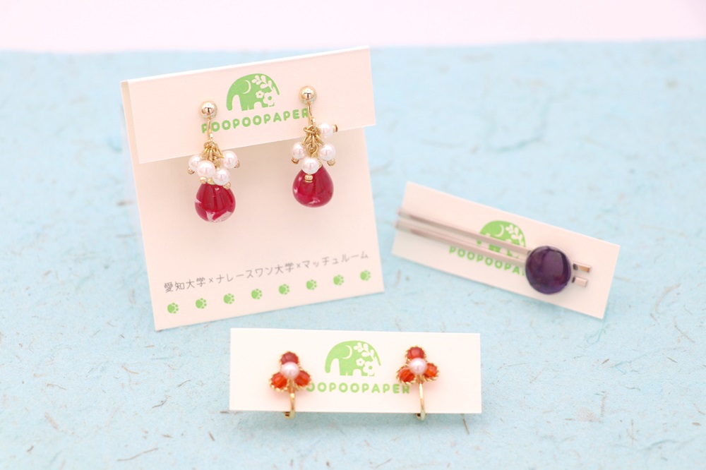 その後、日本へ持ち帰った「プープーペーパー」を使い、アップサイクルアクセサリーを手掛けるマッチュルームと連携して、学生がアイディアを出したピアスやブレスレットなどのアクセサリーと、「カサロンの家」の子どもたちが描いた絵やメッセージを使った商品を制作しました。