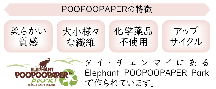 本来廃棄されるはずのものを新たな価値を持つ製品へと生まれ変わらせる取り組み。ゾウのフン(プープー)から取り出した繊維を洗浄、薄く平らにのばし、干して作る「プープーペーパー」は、化学薬品を一切使用していない環境にやさしいアップサイクル商品です。