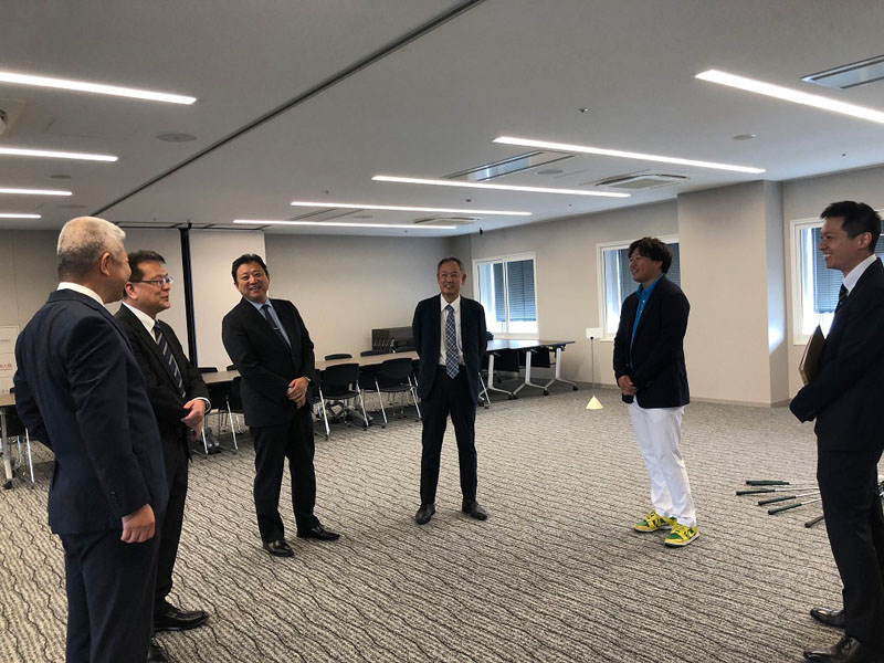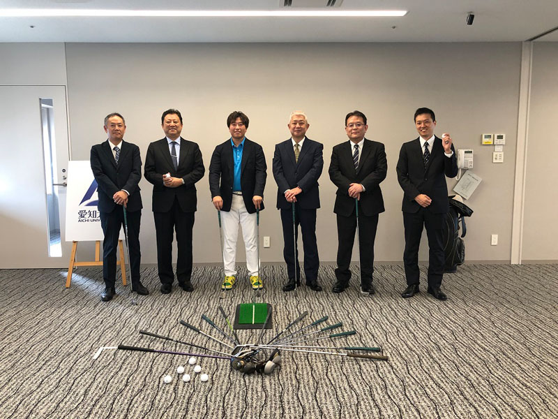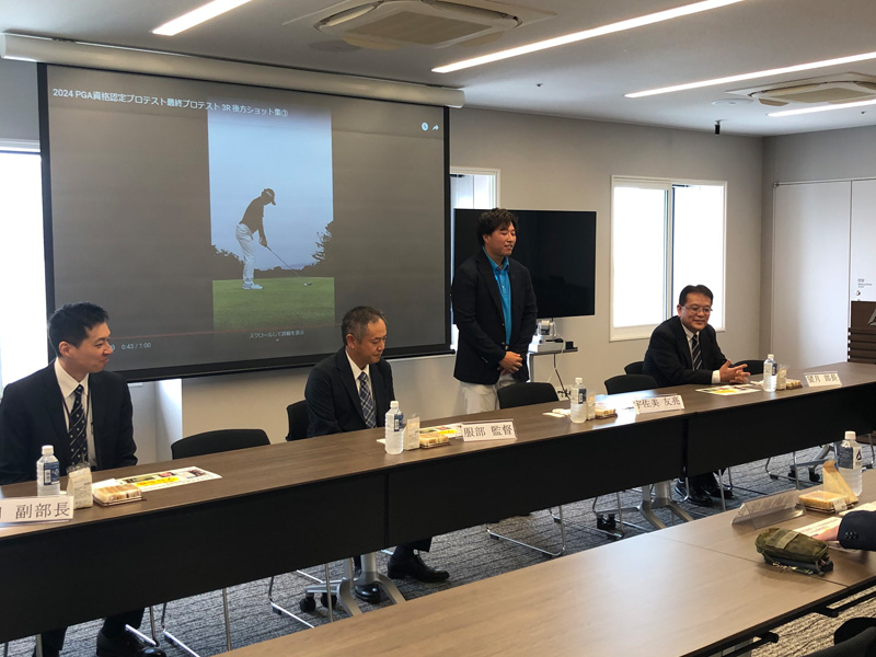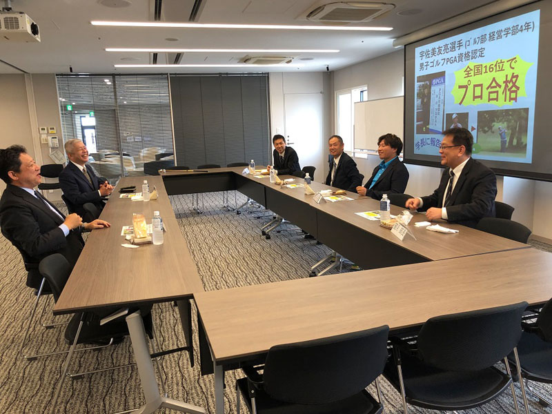 冒頭、宇佐美選手から「50位タイまでが合格条件の中、16位という成績で無事に合格することができました。テスト当日は、何とも言えない緊張感がありましたが、自分らしいゴルフを貫くと決め、集中しました。」との報告、続いて、広瀬学長から「おめでとう、厳しい世界だが頑張って頂きたい」等の祝福、加納スポーツ支援センター長(副学長)からも「限られたスポーツ環境下で、結果を残してくれ嬉しく思う、卒業後も同窓会でバックアップを続ける」等の激励をいただきました。