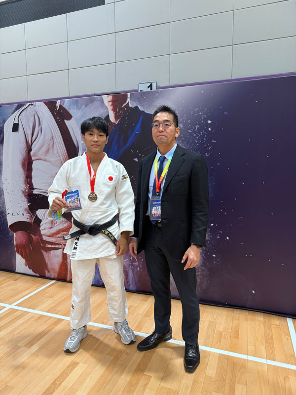 国際大会どころか、海外渡航が初めてで、独特の雰囲気と緊張感がありましたが、試合が始まり畳の上に上がったら、平常心を取り戻していました。1回戦から決勝戦までの4試合、全て一本勝ちをおさめることができ、今まで繰り返し練習してきた技が外国人選手にも通用することが分かり自信になりました。準決勝(台湾)と決勝(韓国)の相手は、ウォーミングアップでの切れがあり、国際大会に複数回出場していたと聞き、警戒しましたが、バッチリ一本を取ることができました。試合間の時間も、しっかり休養をとり、オンオフを切り替え、試合にベストコンディションで臨めました。これからも日々の稽古でもっと強くなれるよう自分を磨く努力を重ねていきたいと思います。