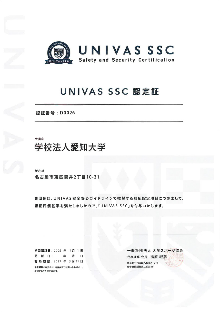 2025年1月1日、本学が一般社団法人大学スポーツ協会(UNIVAS)が制定した安全安心認証「UNIVAS SSC(UNIVAS Safety and Security Certification)」制度の認証を受けました。