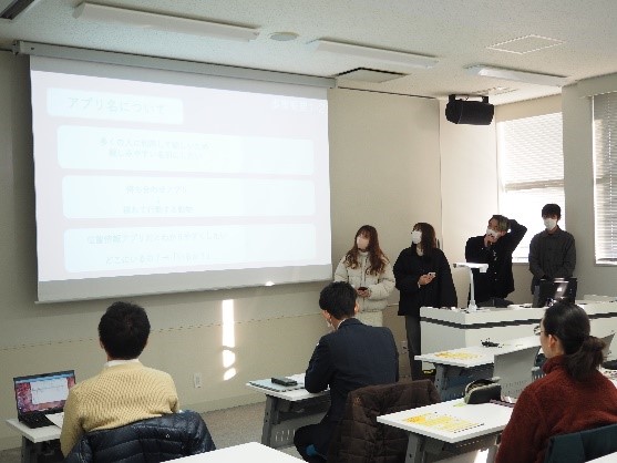 授業で学んだことを基に、発表会では計8チームによりプレゼンテーションが行われ、「旅行をお手軽にしてくれるアプリ」「ファミリーマートとタイアップしたサブスク」「ゴミ問題を解決する」「一人暮らしをサポートする」「イヌ・ネコの殺処分を減らす新たな取り組み」など、学生ならではの視点で考案された多彩なプランが提案されました。