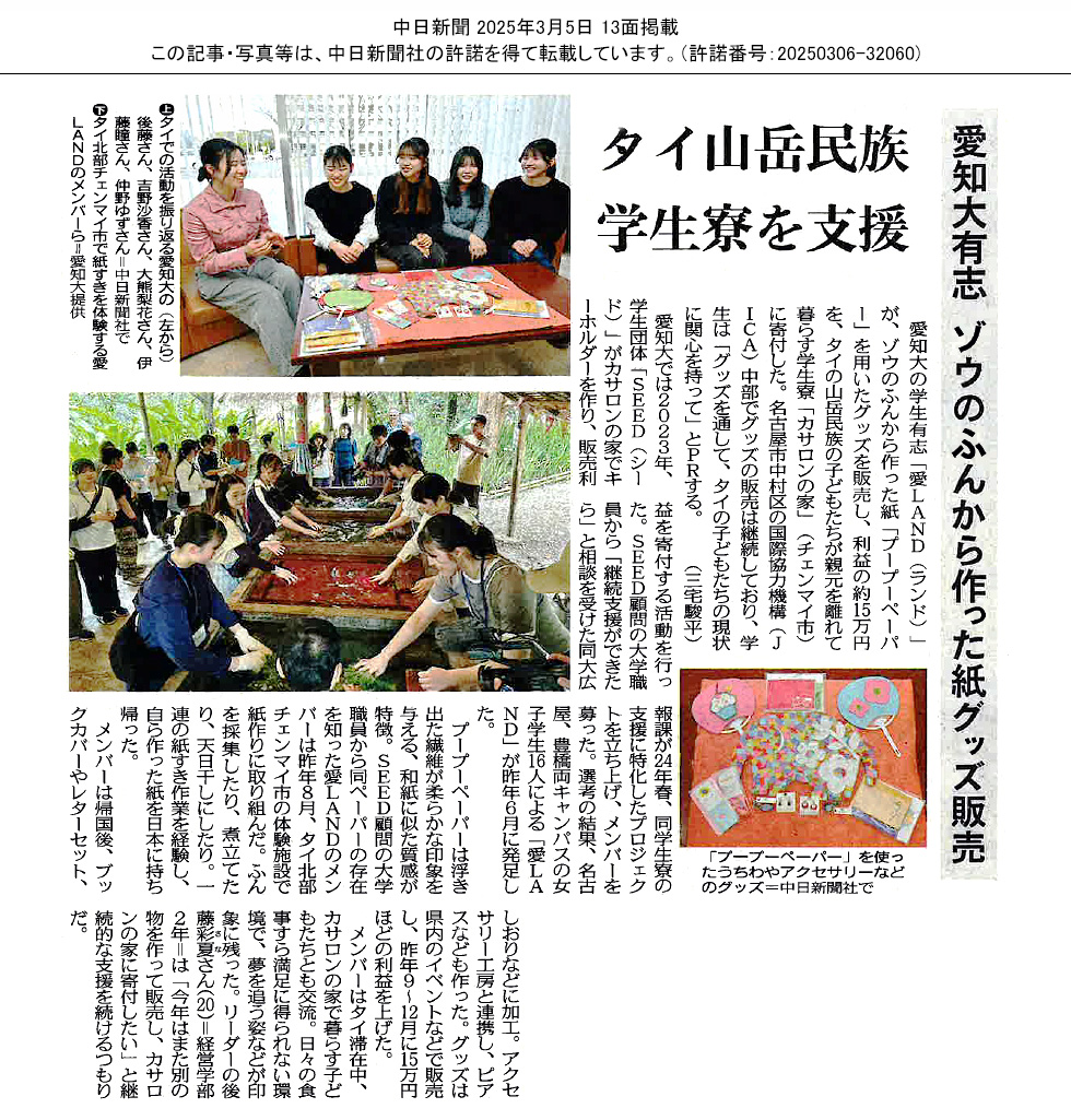 2025年3月5日の中日新聞に、本学学生によるタイ山岳少数民族学生寮支援活動紹介記事が掲載されました。