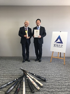 本学はこの度、大学スポーツの振興を目的とした『UNIVAS AWARDS 2024-25』において、2つの受賞を果たしましたこと、改めて学長・スポーツ支援センター長にトロフィー、メダルを持参、受賞の報告をいたしました(3月19日 12:00~ 名古屋キャンパス本館19階会議室)。