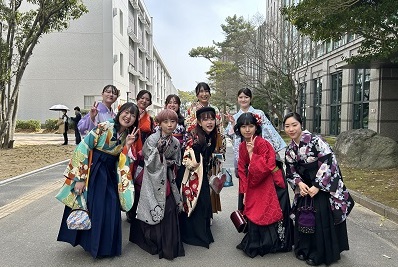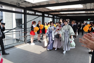 名古屋キャンパスでは、学位記授与式後、グローバルコンベンションホールから各教室に移動する学生に対して、ゆずの「栄光の架け橋」をBGMに祝福の意を込めて、教職員や應援團(リーダー部、チアリーディング部)より拍手で送り出しを行いました。またキャンパスモールにて学長、副学長と一緒に記念撮影も行いました。