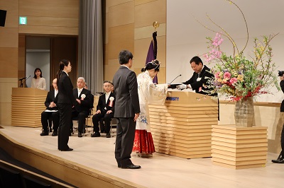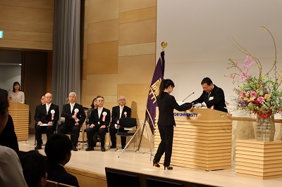 学長告辞では、広瀬学長より「皆さんの「青春」には、コロナという壁が立ちはだかりました。かつて思い描いていたような大学生活を、完全には実現できなかったかもしれません。しかし、そうした状況の下でも、しっかりと学業を修め、「卒業」に至ったこと、実に素晴らしいと思います。」と述べ、「これから、「社会」という大きな海に出て行くことになります。政治・経済でこれまでの常識が覆るような大きな変化が起きており、その海は荒れているようにも感じます。不安や戸惑いを持っている人もいるかもしれません。もっとも、社会というのは動いていくものです。人が移り変わっていくためです。ですから、結局のところ、いつの時代でも、学び続け、もがき続けなければなりません。しかし、安心してもらいたいのです。本学で学んだことは、これからも学び続け、もがき続ける、正しい基盤になるはずです。そして、社会では、16万人も存在する「先輩」が温かく迎え入れてくれます。思い切って、飛び込んでいきましょう。その際、「Z世代」という、他人が作った服を着ている必要はありません。皆さんは、皆さんです。他人とは、見方・考え方が違って当然なのです。遠慮する必要は全くありません。自信を持って、これからの人生も謳歌してください。」等と激励されました。