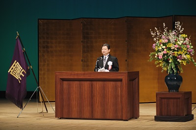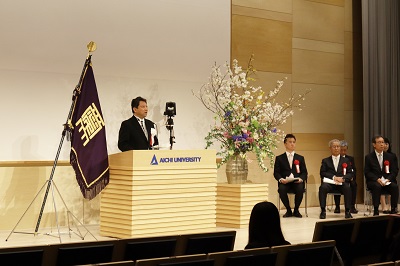 広瀬裕樹学長の告辞では、本学の歴史や学内に設置されている「自由受難の鐘」に触れ、「「自由を求めれば、必然的に苦難は避けることはできない」というメッセージを、どのように解釈して、受け止めるか、それは皆さんに任せます。ただ、先輩たちからのこのメッセージを大学生活での道しるべにすれば、そのような学びは、本学でしか得られないことでしょう。愛知大学で学ぶことの真の価値が分かるのは、これからです。」とし、「大学での4年間は、あっという間です。今日から大学生活を存分に謳歌してください。」と呼びかけました。