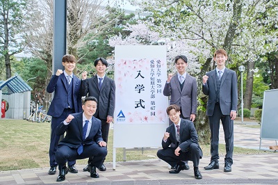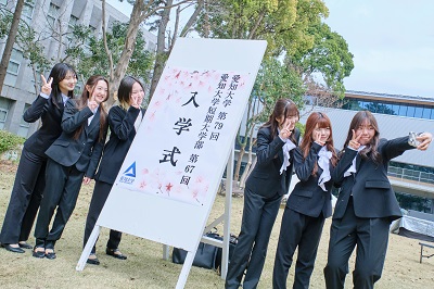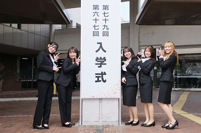 式の開会前や閉会後には、入学式の立て看板前で家族や友人らと記念撮影する新入生が長い行列を作り、ちょうど満開を迎えた桜の前でも記念写真を撮る新入生が目立ちました。