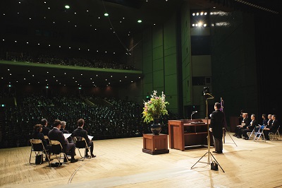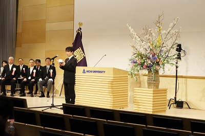 学長告辞、来賓祝辞を受け、新入生の代表者から力強い「新入生宣誓」があり、次に在学生の代表者が「歓迎の辞」を述べ、東亜同文書院記念基金特別奨励賞の授与後、入学式が終了しました。