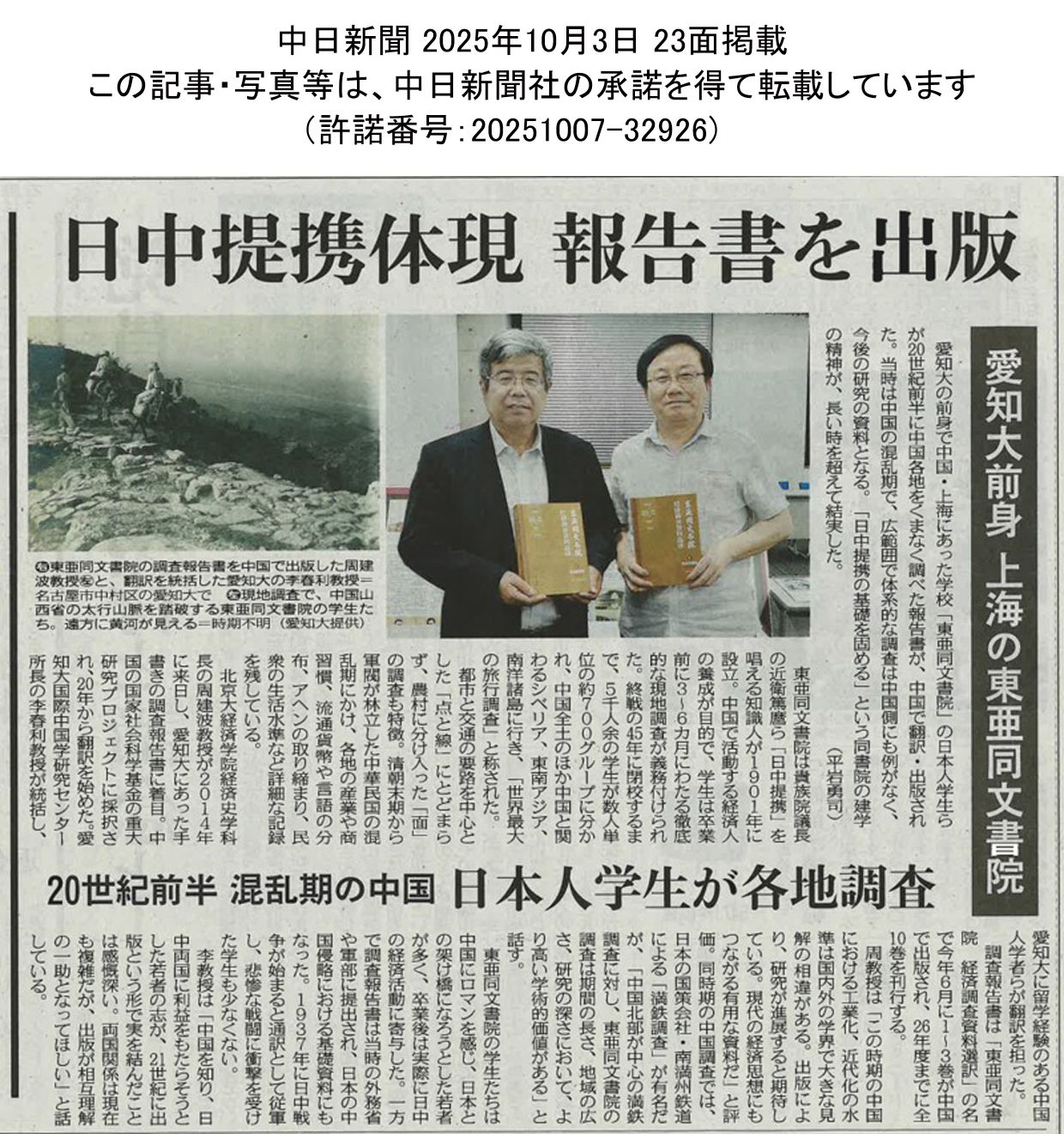 2025年10月3日の中日新聞に、中国・上海にあった本学の前身である「東亜同文書院」の日本人学生が中国各地を調査し、まとめた報告書が中国で翻訳・出版されました。本件に関し、本学の李春利国際中国学研究センター(ICCS)所長と周建波北京大学経済学院経済史学科長・愛知大学ICCS訪問教授が取材を受け、記事が掲載されました。
